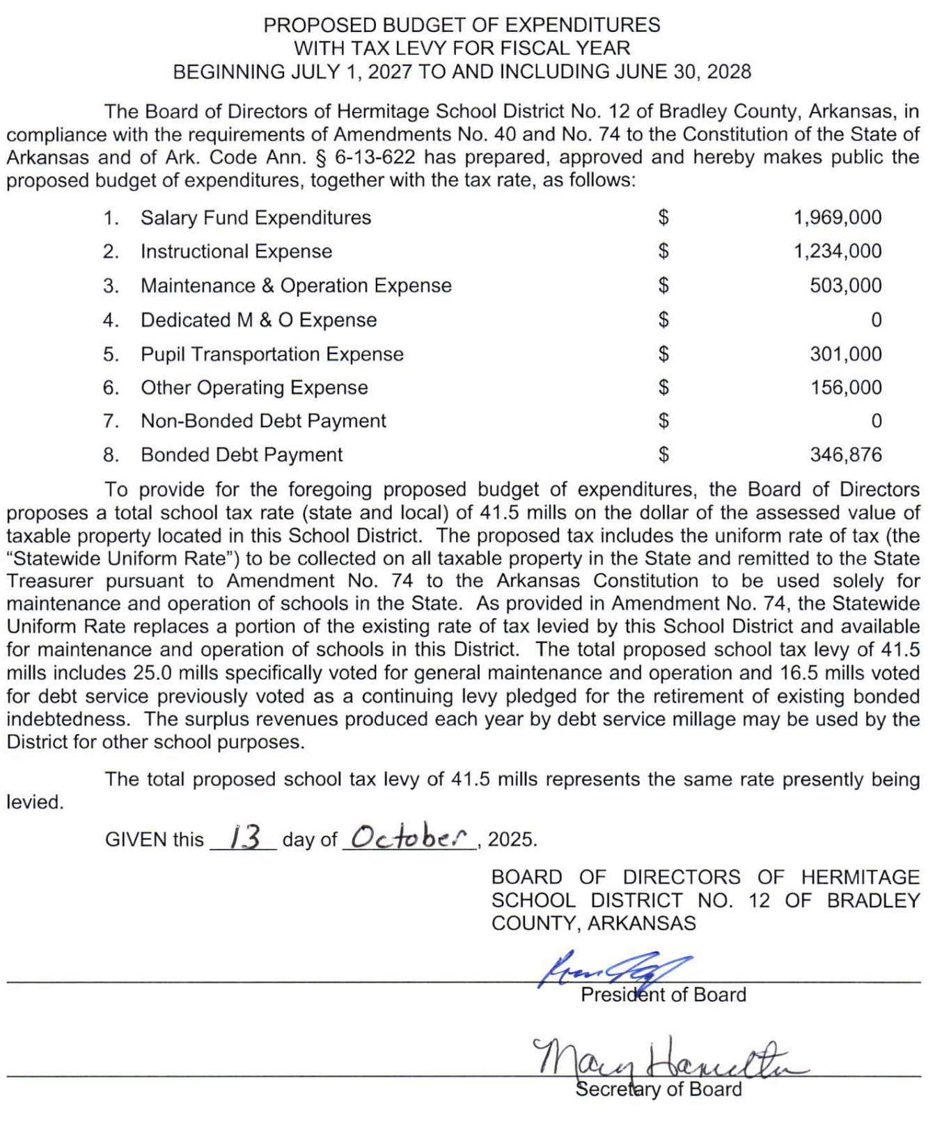 Hermitage School District: Proposed Budget of Expenditures with Tax Levy for Fiscal Year Beginning July 1, 2027 to and Including June 30, 2028