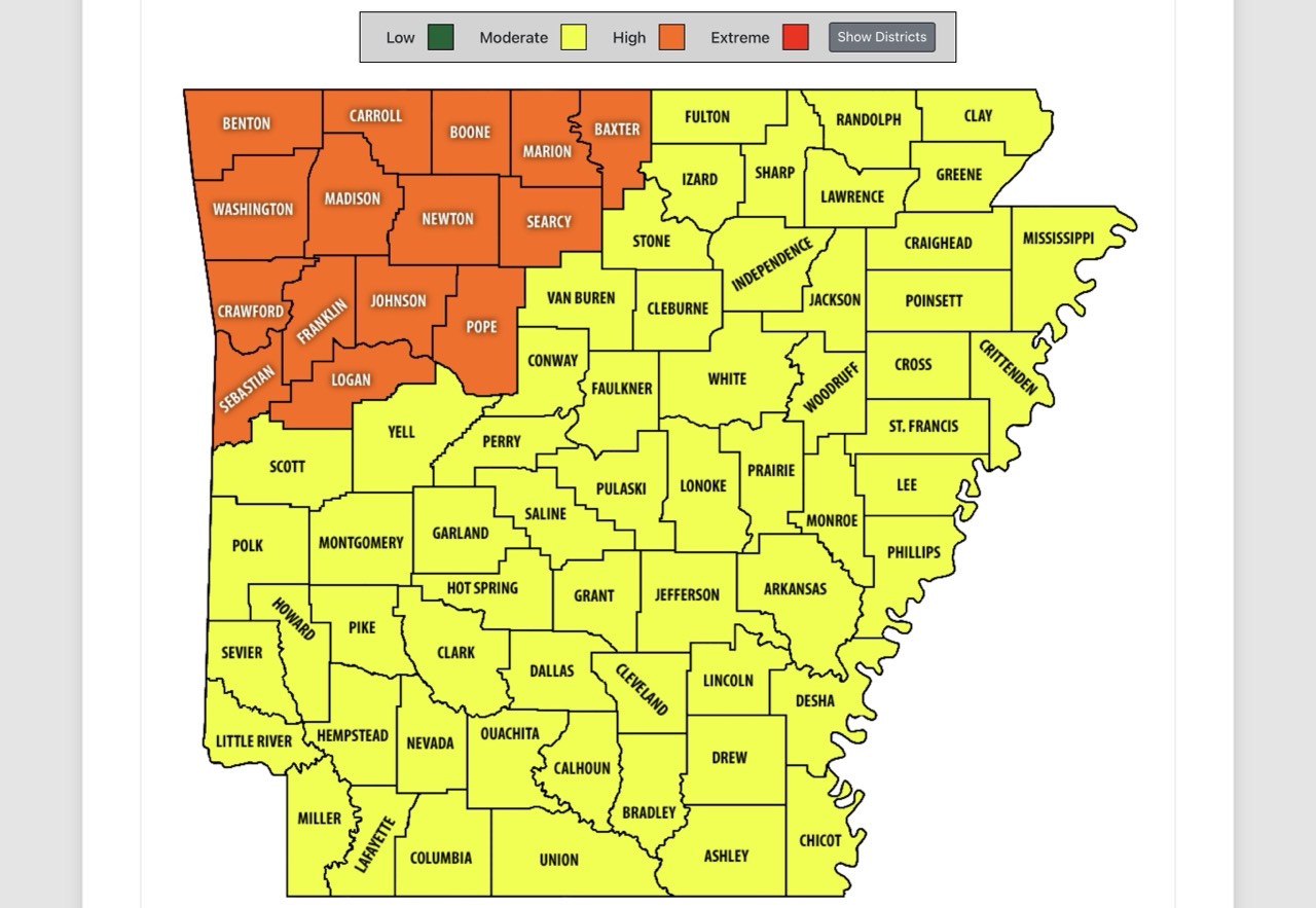 According to the map, much of the state is under moderate wildfire danger, while several counties in northwest Arkansas are listed at high risk. The wildfire danger levels are determined by fuel conditions, drought status, and long-term weather forecasts, and are categorized based on how easily fires can start and how difficult they may be to contain.