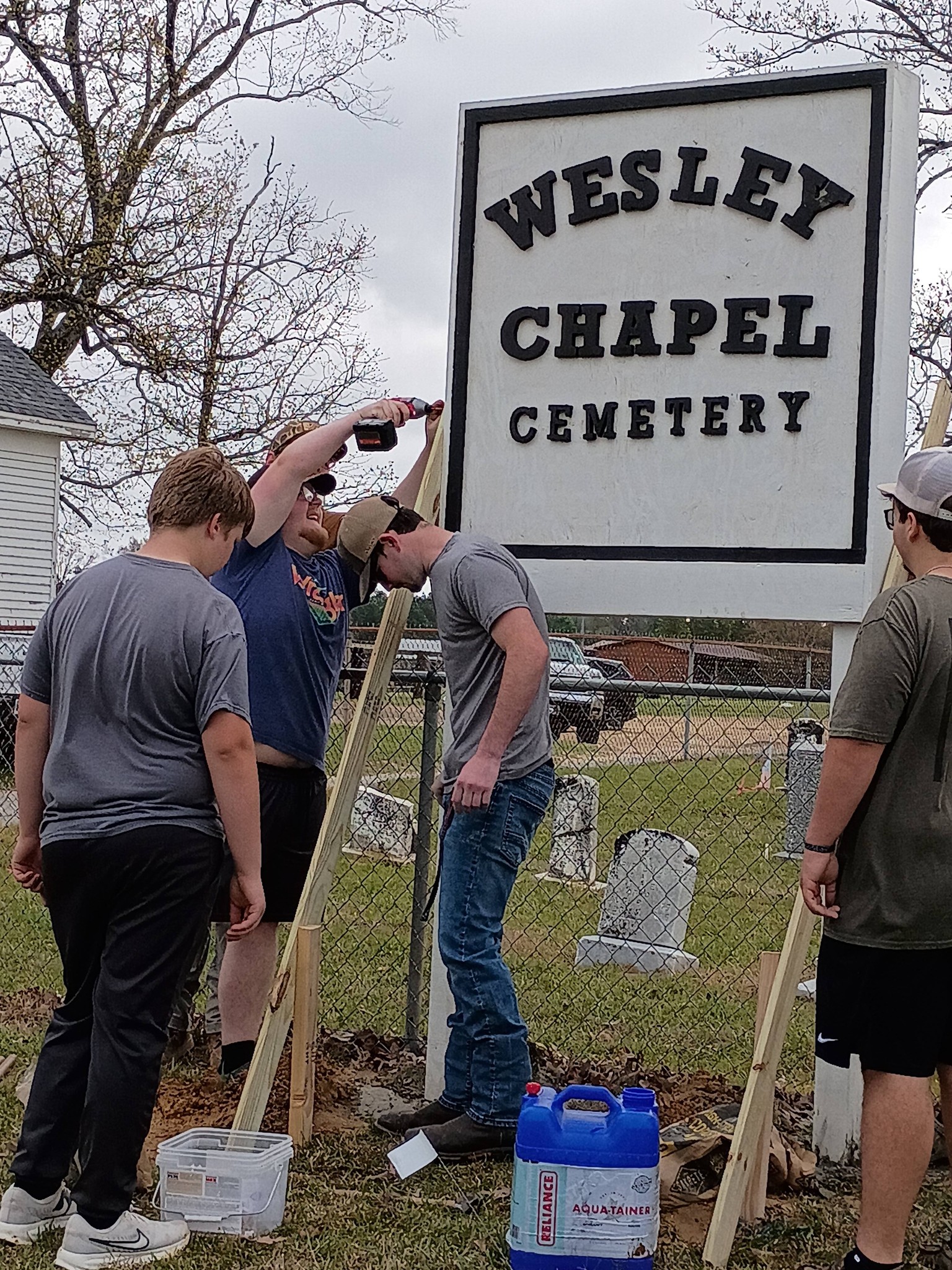 According to a post from the Woodlawn High School Spanish program, the project was completed in cooperation with Morgan Wooley King, Blake King Plumbing, WHS SEACBEC Construction students, and professor Jeremy Groves. The group worked together to build and install a new sign for the Wesley Chapel Church and cemetery.